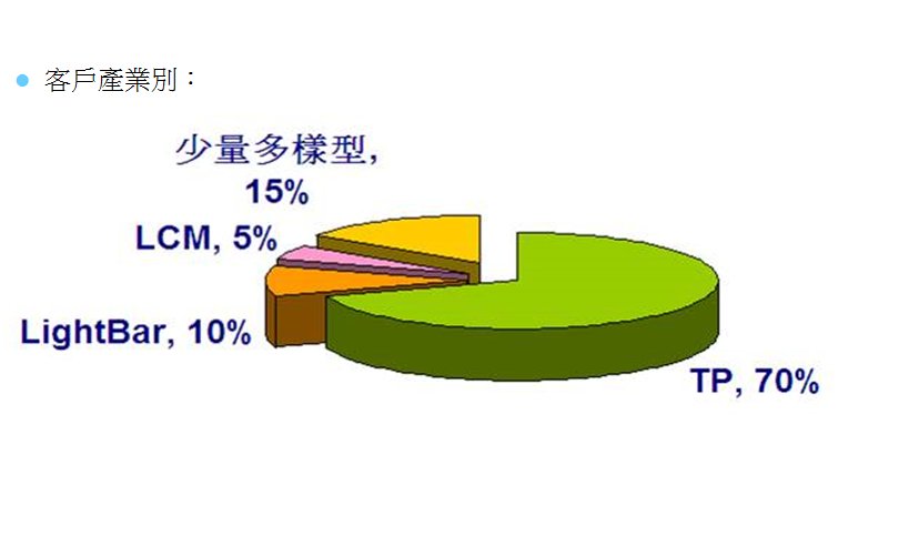 目前主要客戶以觸控面板、NB背光源、LCM、醫療應用儀器、工業用電腦